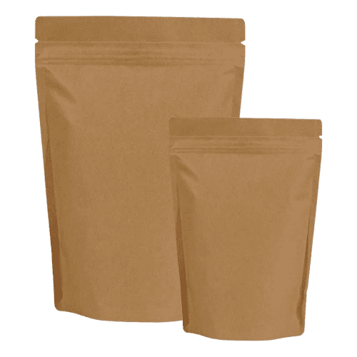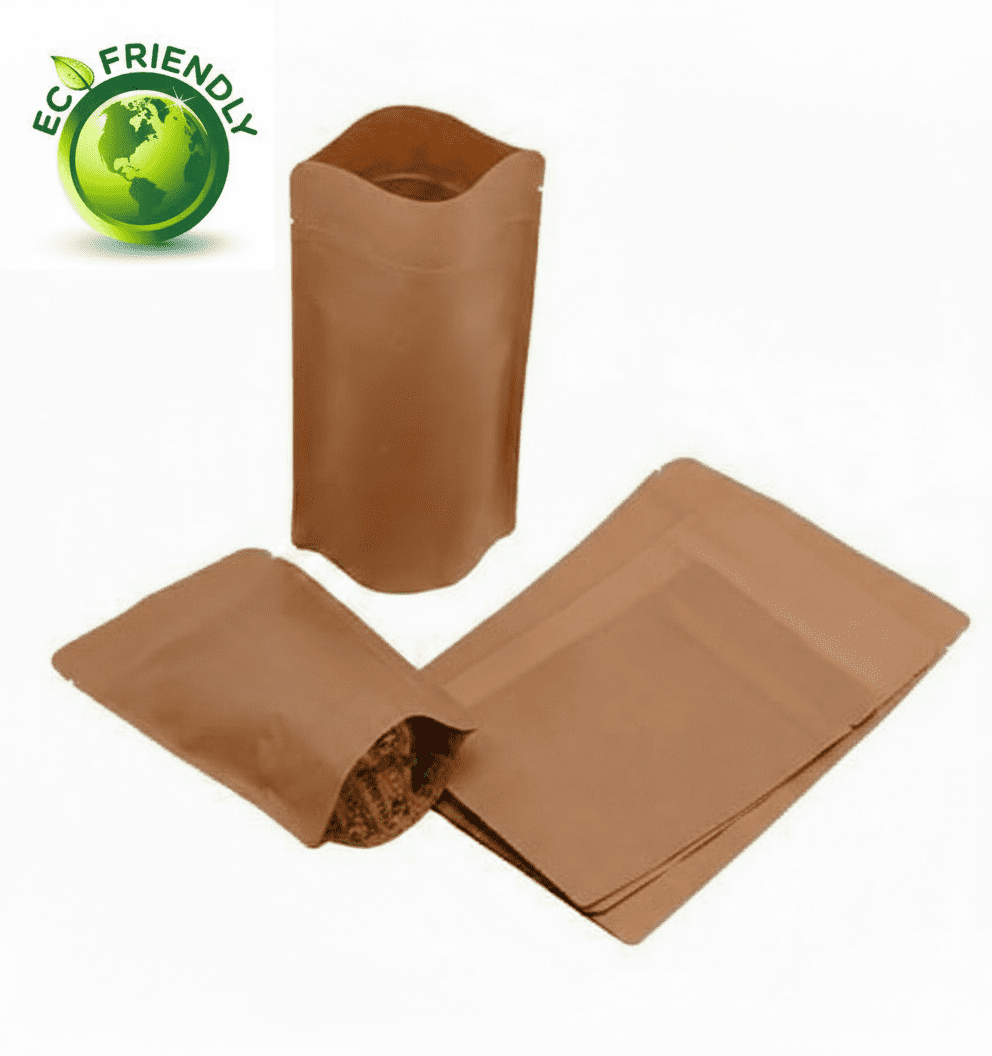 Eco-Friendly Standup Pouches made from PLA, Kraft Paper, Mono-PE, and Cellulose Film for sustainable packaging. Featuring zipper closure, natural kraft finish, and multiple size options for eco-conscious product protection and presentation.