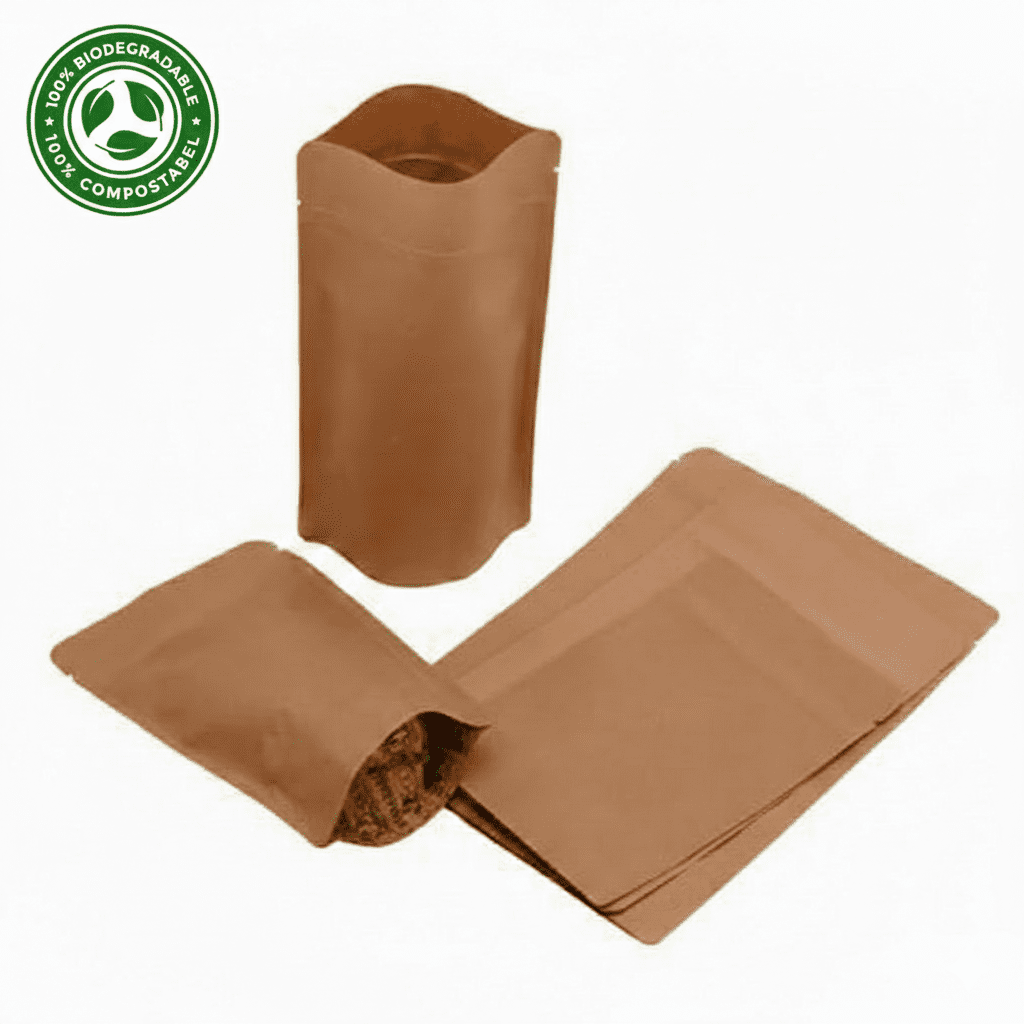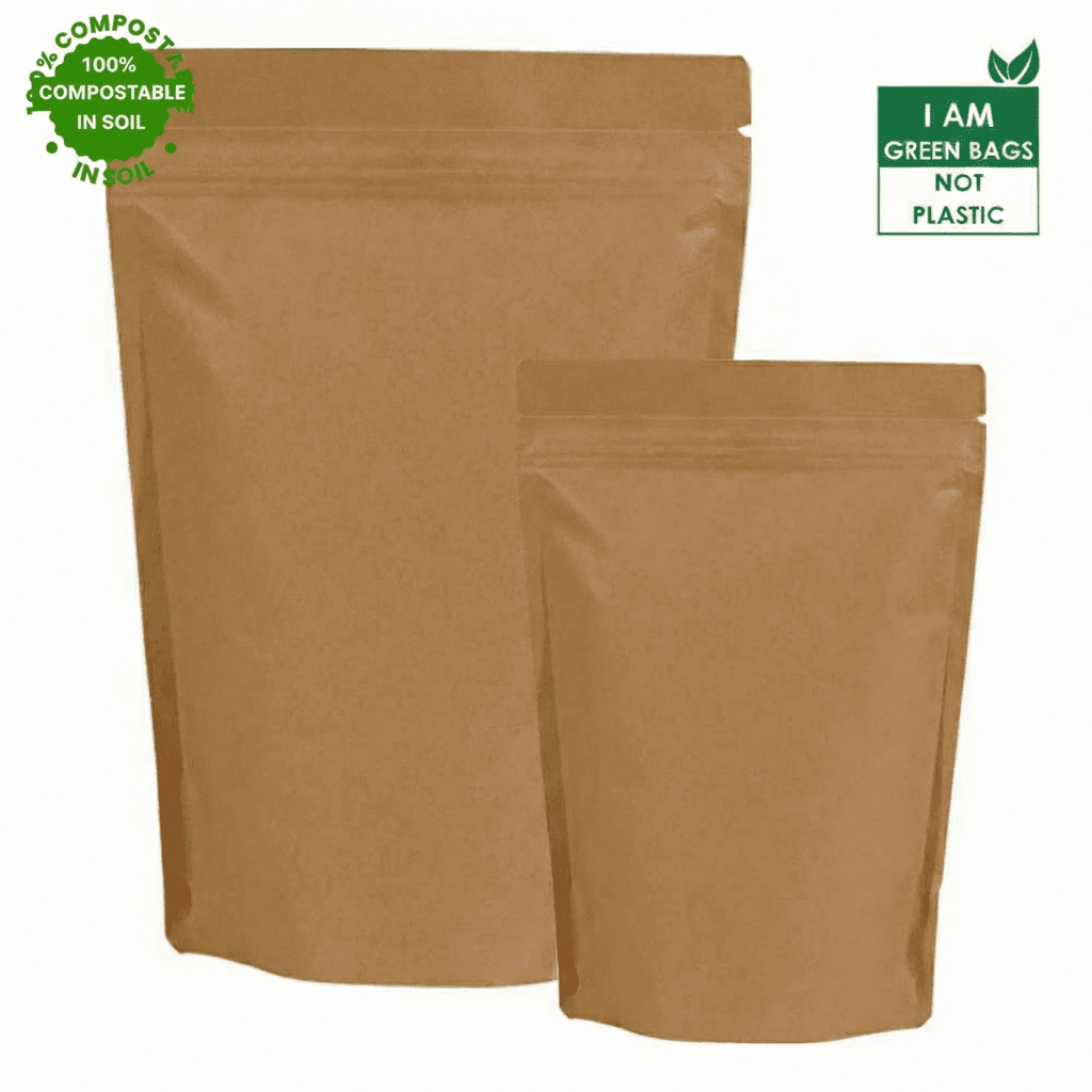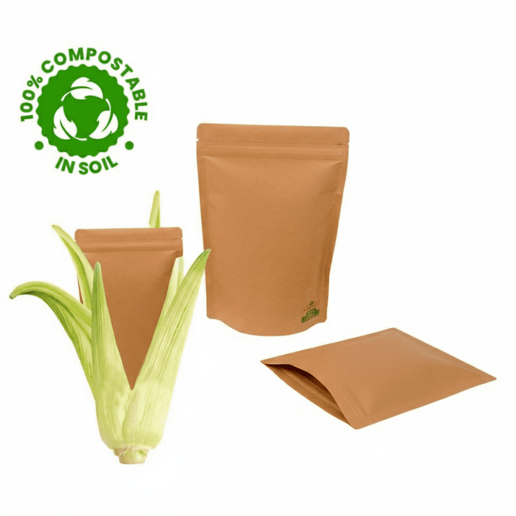 Sustainable Plant Made Pouches crafted from corn starch, sugarcane fiber, PLA bioplastic, and cellulose film. Standup design with zipper closure, natural kraft finish, and multiple size options for eco-friendly packaging.